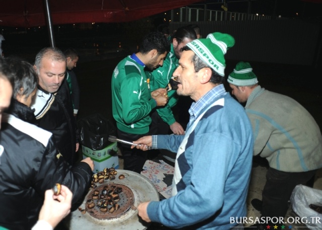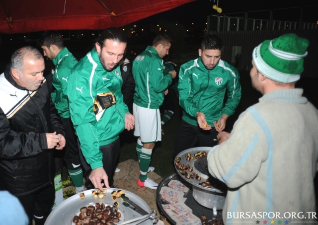 Uludağ eteklerinde kestane yetiştiren bir taraftarımız Özlüce Tesisleri'ne gelerek antrenman sahası kenarında kömür ateşinde pişirdiği kestaneleri futbolcularımıza ikram etti. Özellikle yabacı futbolcularımızın çok beyendiği kestaneler antrenman sonunda kısa sürede tükendi.